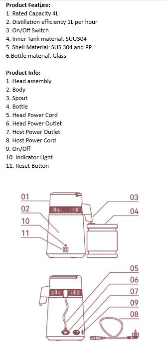 Crafted from high-grade stainless steel grade 304, ensuring years of flawless performance. Enjoy pure, distilled perfection with ease: simply fill the glass jug, press Reset, and watch as it transforms tap water into crisp purity. Maintenance is hassle-free with included Citric Acid Cleaning Crystals and replaceable carbon filter sachets. Upgrade your drinking water today. Pure satisfaction awaits with every glass.